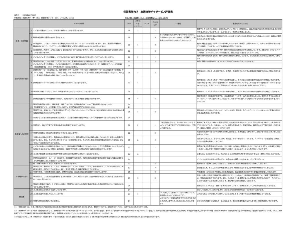 保護者の方々にご協力いただき実施いたしました。令和7年度「事業所評価アンケート」の結果報告をいたします。