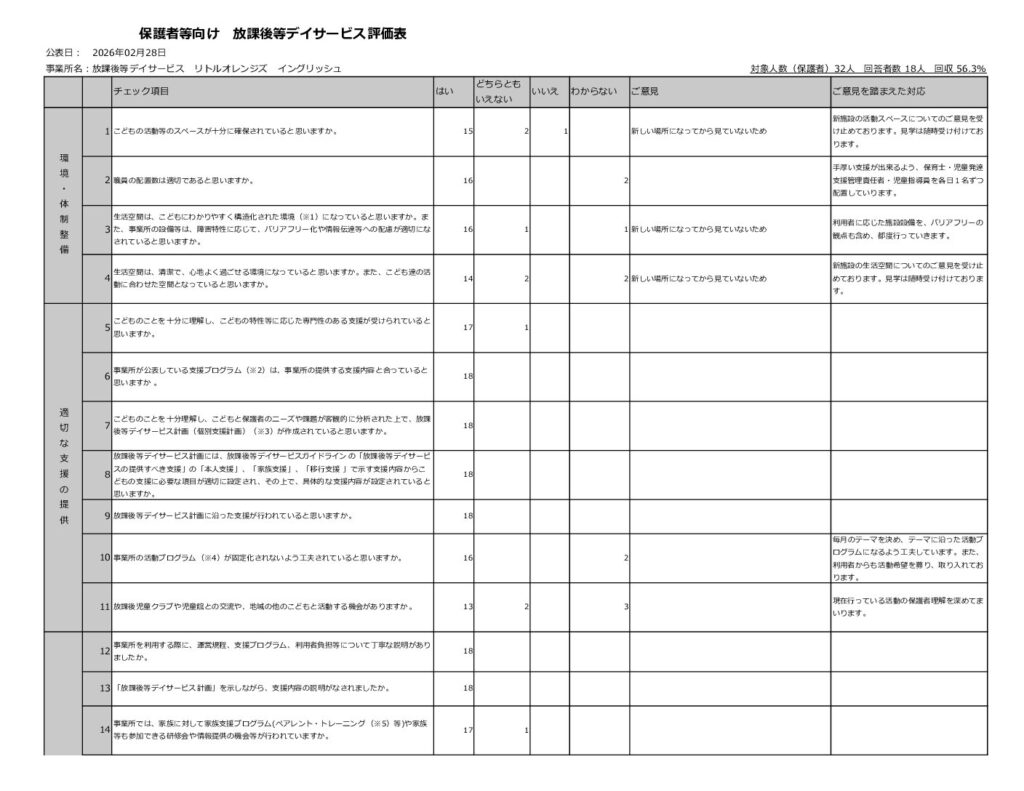 保護者の方々にご協力いただき実施いたしました。令和7年度「事業所評価アンケート」の結果報告をいたします。